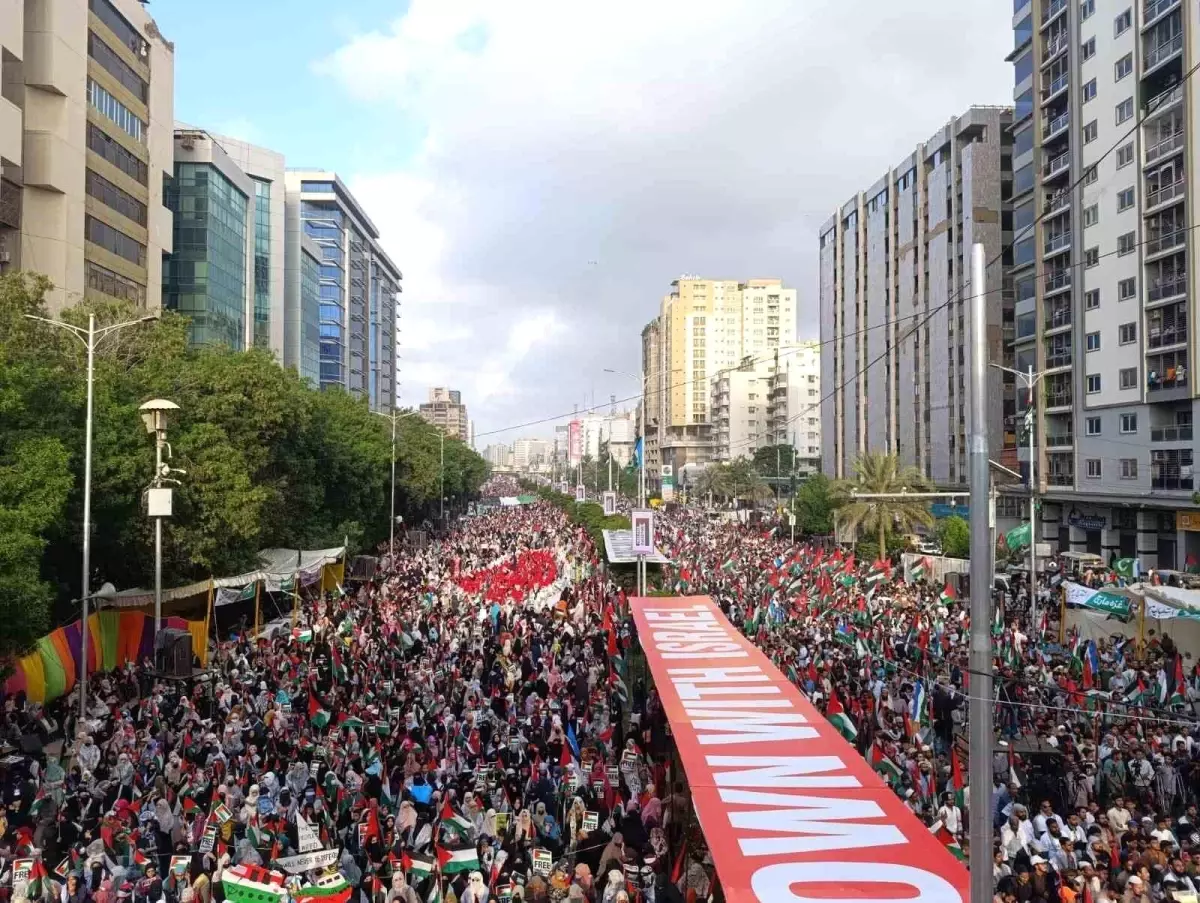 Karaçi’de binlerce kişi, Gazze Şeridi’ne destek amacıyla Filistin bayraklarıyla yürüdü.